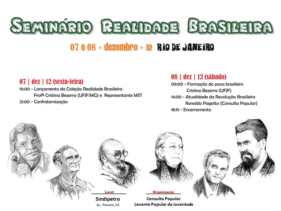 A Consulta Popular e o Levante Popular da Juventude convocam para o Seminário sobre Realidade Brasileira – “A formação do povo brasileiro e a Revolução brasileira”. O SRB ocorrerá nos dias 07 e 08/12, no auditório do Sindipetro/RJ (Avenida Passos, 34 – Centro do Rio). O horário segue no cartaz em anexo. Inscrições e maiores informações pelo e-mail: corealidadebrasileira@gmail.com.